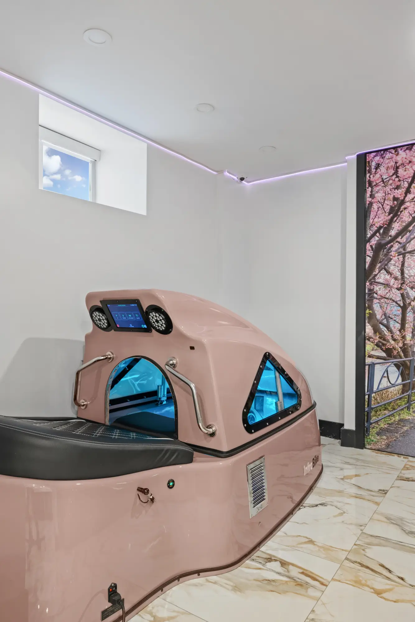 Our recumbent infra-bike, reclined for better back support and less joint strain, allows you to actively experience nature’s breathtaking landscapes while cycling in indoor comfort. This low-impact, 25-minute, cardio and endurance burst, burns it off in a most